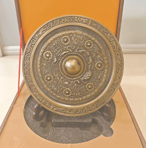 ——漢代“人民昌·中國強”銅鏡,現收藏于陜西大唐西市博物館,是該館的鎮館之寶。該銅鏡直徑22.3厘米、厚0.7厘米,采用范鑄法與淺浮雕、高浮雕工藝制作。鏡背鑄有47字銘文,包含“人民昌·中國強”吉語,字體融合隸書與懸針篆特征,為迄今唯一帶有該銘文的漢代銅鏡。