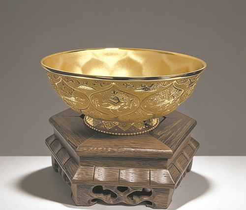 ——唐·鴛鴦蓮瓣紋金碗,唐代金器,現收藏于陜西歷史博物館,也是該館的鎮館之寶。碗內蓮心、外壁蓮花瓣圖案,宛若一朵盛開的金蓮花。蓮瓣分上下兩層,每一層10個蓮瓣。上層裝飾有動物圖案,動物或奔走佇立,或銜弄花草、梳理羽毛,動靜結合,栩栩如生。金碗形態莊重大方,紋飾紛繁瑰麗,圖案元素貫通中西,是大唐盛世的縮影。