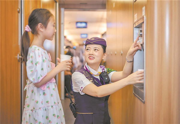 圖為車菲菲在給兒童旅客講解高鐵上電茶爐的使用注意事項。周 圍 攝