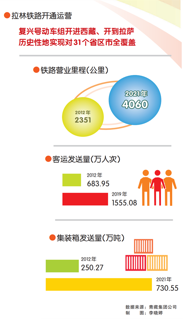 內外互聯,人享其行、物暢其流。圍繞西寧、格爾木、拉薩等中心城市,十年間,高原鐵路不斷延伸,一張四通八達的高原鐵路網正在形成。截至2021年,高原鐵路營業里程從2012年的2351公里增加到4060公里。一條條現代化的高原鐵路,拉近了雪域高原與祖國各地、與世界的距離,青藏高原正在成為祖國西部改革開放的前沿陣地。