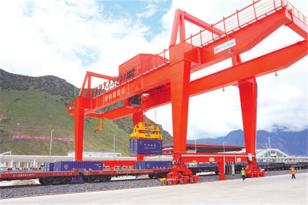 林芝站貨場正在卸載集裝箱。周悅翔 攝