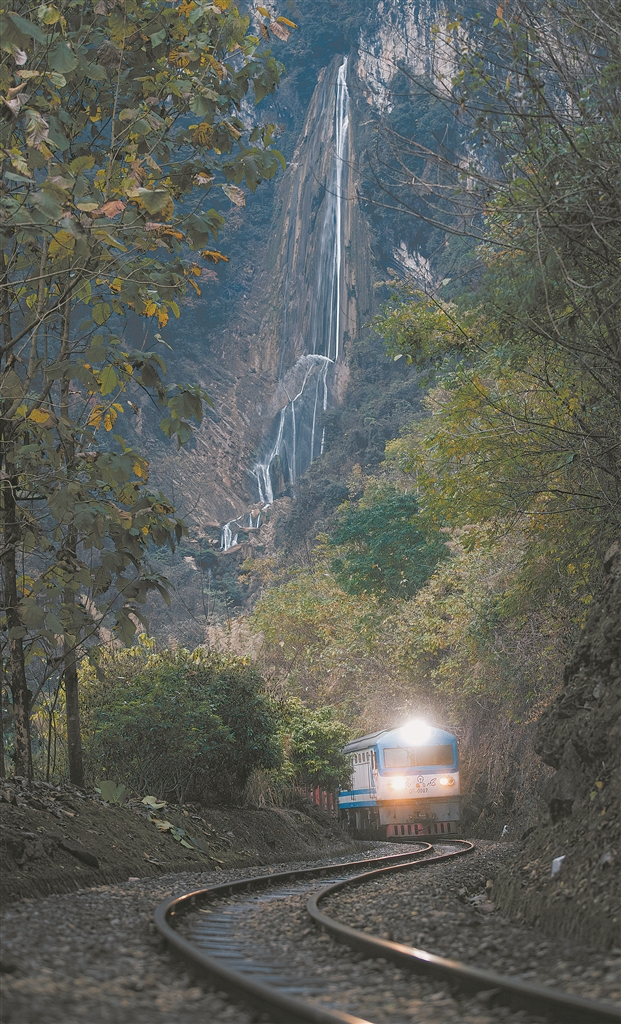 故事:昆河鐵路在山腰盤旋,途經一處彎道時,正好與一條銀絲帶般的高山瀑布同框