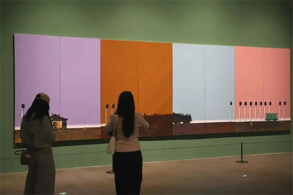序廳以《奔騰·歲月》開篇,描繪中國鐵路發展的重要階段。作品中的機車主體以黑、白、灰為主色調,盡顯硬朗雄厚的力量感;而背景的紅、黃、綠三種高飽和度純色,則為機械的冰冷感賦予了強烈的當代視覺沖擊力。觀眾得以從中國鐵路的巨變中,真切感受到中國的飛速發展和時代變遷。