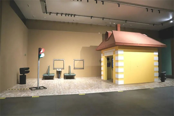 展廳中,一件名為《站臺》的大型裝置作品尤為引人注目。作品以東北地區火車扳道房為原型,淺紅褐色屋頂與赭石色墻體復刻了工業記憶,地面如白雪覆蓋,搭配綠皮火車座椅、茶幾與模擬車窗,再輔以信號燈的光影點綴,讓每一位觀眾都能成為這段旅途中的風景,完美詮釋了“場域性景觀”的藝術構想。