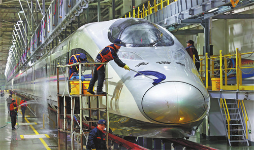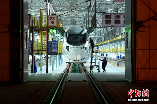 1月16日晚,在北京動車段北京北動車運用所,工作人員在清洗和諧號動車組。據了解,在春運高峰時段,北京北動車所每...