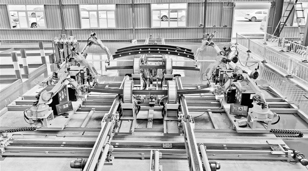 在長贛高鐵9標智慧產業園鋼結構加工廠,6臺自動焊接機械臂正在焊接鋼材料。劉述鵬攝
