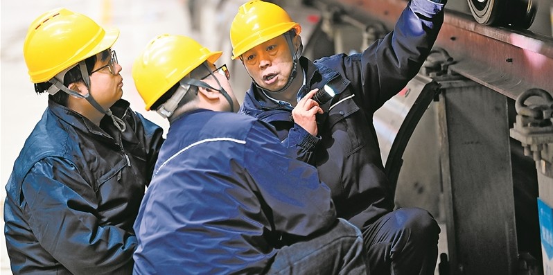 圖為董宏濤(右一)和青年職工檢修動車組列車。